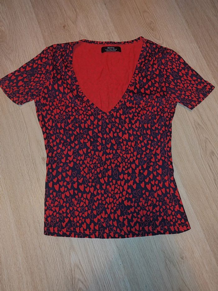 En très bon état. Taille S. T-shirt col V noir motifs coeurs rouge