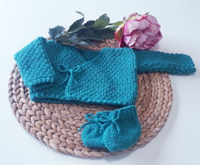 Vêtement layette brassière gilet kimono cache-coeur 30 % laine  tricoté main bébé naissance - photo numéro 1