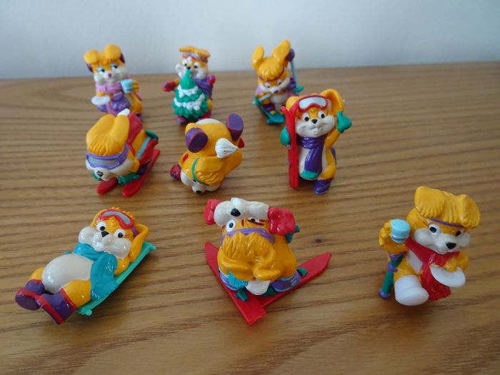 Lot de 9 figurines des lapins de collection kinder au ski, en très bon état. Un personnage a sa planche absente. Série non complète : 9/10.