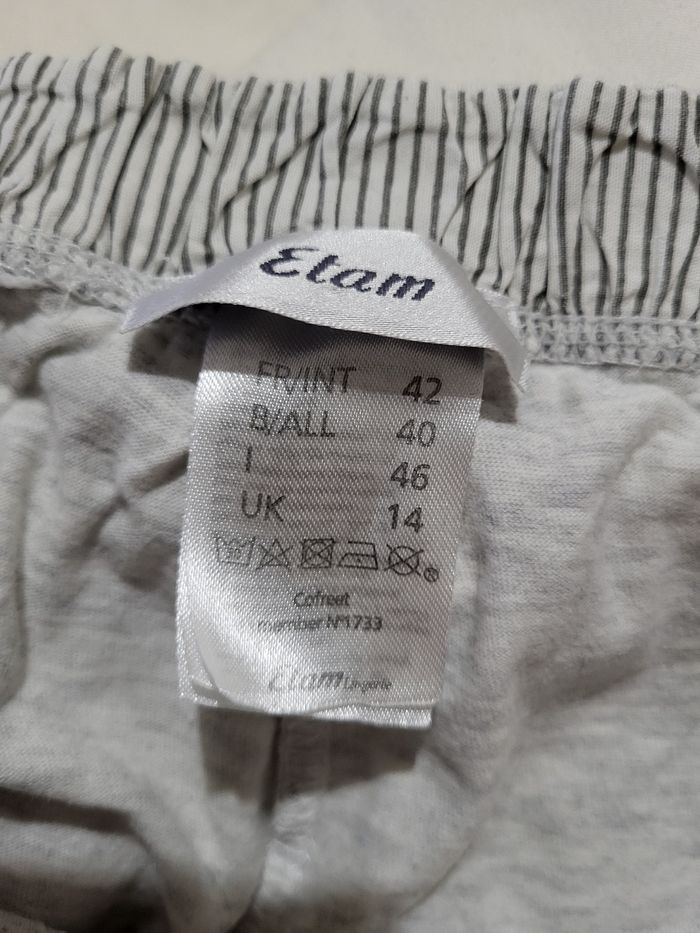 Bas de pyjama pantacourt gris Etam. Taille 42 100% coton Jamais mis, mais lavé une fois. Un mini trou dû à ma machine à laver 😞 (cf photos)