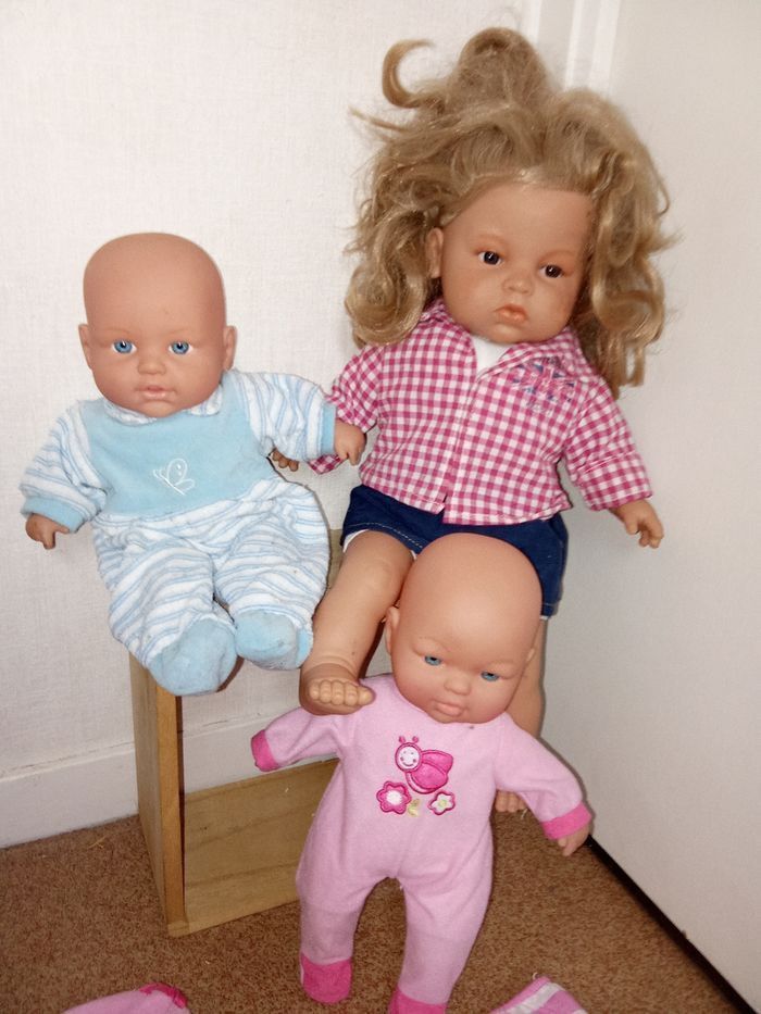Lot de 3 poupée corps souple : 📌la plus grande mesure environ 45 cm habillée avec ses vts d'origine, nécessitera un coiffage 📌 les 2 autres plus petits mesure 30 cm, ceux ne sont pas leurs vts d'origine. Qq traces d'utilisation sur les 2 petits. 🎈Possible de vendre séparément 10€ la plus grande et 5€ l'unité pour les plus petits ( vts inclus) Bon etat général pour ce lot, je rajoute les qq vts Supplémentaires. Prix pour le lot Beaucoup d'autres jeux jouets puzzles livres enfants également à vendre ds mon dressing et réduction activée