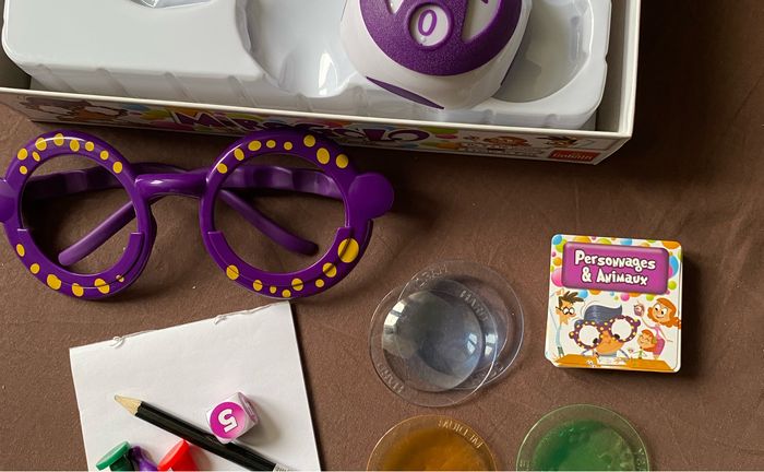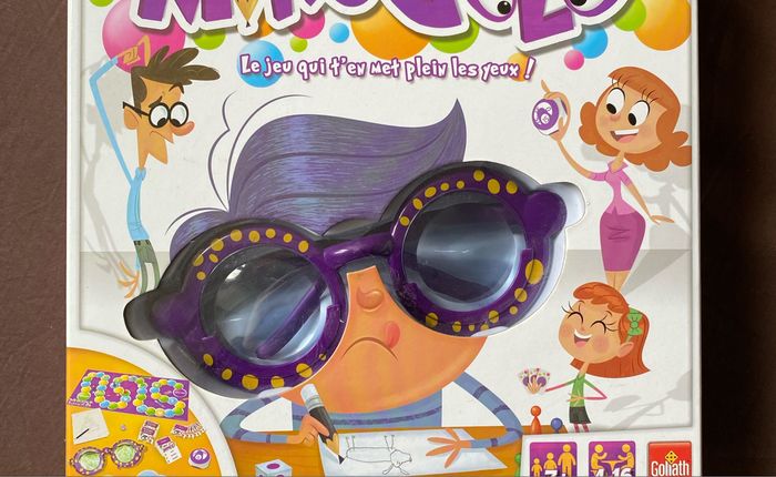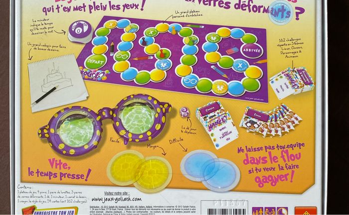 Dans la boîte il y a : - les lunettes - 3 verres déformants (bleu, jaune, vert) - le plateau - un calepin avec 1 crayon - 4 pions et 1 dé - 162 cartes avec 3 thèmes (mieux, choses, personnages & animaux) - 1 minuteur