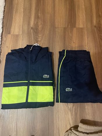 Ensemble salopette à jambes courtes et bretelles ajustables par boutons avec boutonnière et t-shirt à manches courtes. La salopette est de couleur beige avec des motifs d'animaux sauvages (lion, zèbre, toucan, panthère, girafe, perroquets), de palmiers et de nuages gris foncé, oranges et vert clair. Poche sur le devant avec un motif de zèbre. Ouverture sur les cotés, fermeture par boutons avec boutonnière. Ouverture à l'entrejambe, fermeture par boutons pression. Le t-shirt à de fines rayures blanches et vert clair. Composition salopette 55% lin 45% coton ; t-shirt 100% coton.