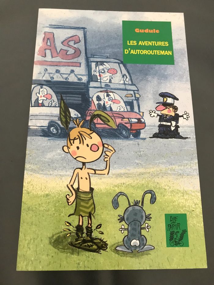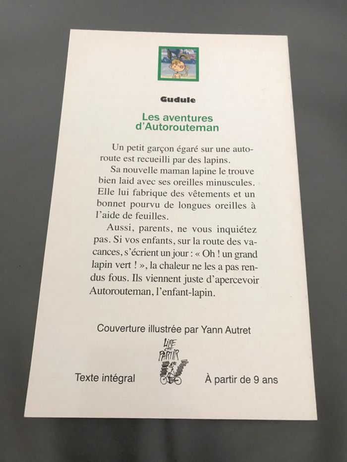 Livre Les aventure d'Autorouteman Auteur(s) : Gudule Editeur : Yann Autret Collection : lire c'est partir Langue : Français Nombre de pages : 64 Un petit garçon égaré sur une autoroute est recueilli par des lapins. Sa nouvelle maman lapine le trouve bien laid avec ses oreilles minuscules. Elle lui fabrique des vêtements et un bonnet pourvu de longues oreilles à l'aide de feuilles. Aussi, parents, ne vous inquiétez pas. Si vos enfants, sur la route des vacances, s'écrient un jour: "Oh! un grand lapin vert!", la chaleur ne les a pas rendus fous. Ils viennent juste d'apercevoir Autorouteman, l'enfant-lapin. #livre #lirec'estpartir #autorouteman #lapin #gudule