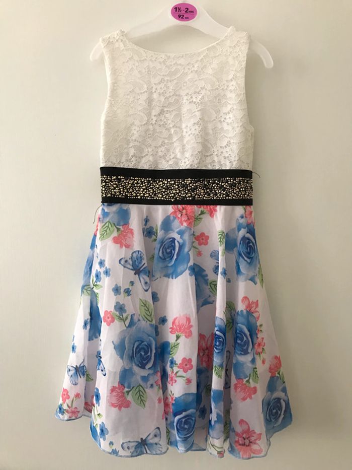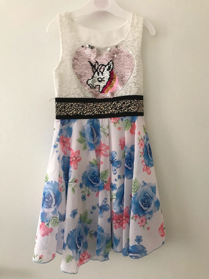 Très jolie robe fille sans manches, cintrée à la taille avec une ceinture élastique pleine de strass (certains sont manquants) Motif licorne en sequins réversibles Super légère et agréable à porter Taille 4 ans #robe #fille #licorne