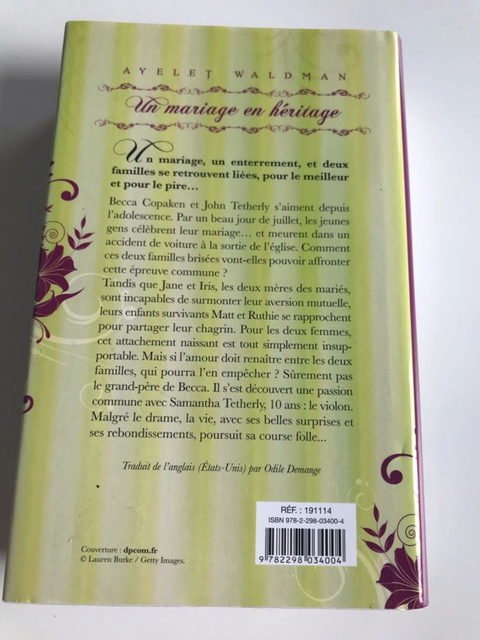 Livre Un mariage en héritage Auteur(s) : AYELET WALDMAN Editeur : France Loisirs Langue : Français Nombre de pages : 568 Un mariage, un enterrement, et deux familles se retrouvent liées, pour le meilleur et pour le pire..... Becca Copaken et John Tetherly s'aiment depuis l'adolescence. Par un beau jour de juillet, les jeunes gens célèbrent leur mariage...et meurent dans un accident de voiture à la sortie de l'église. Comment ces deux famil commlunezles brisées vont- elles pouvoir affronter cette épreuve commune ? Tandis que Jane et Iris, les deux mères des mariés, sont incapables de surmonter leur aversion mutuelle, leurs enfants survivants Matt et Ruthie se rapprochent pour partager leur chagrin.Pour les deux femmes, cet attachement naissant est tout simplement insuportable.Mais si l'amour doit renaître entre les deux familles, qui pourra l'en empêcher ? Sûrement pas le grand-père de Becca. Il s'est découvert une passion commune avec Samantha Tetherly, 10 ans: le violon. Malgré le drame, la vie, avec ses belles surprises et ses rebondissements, poursuit sa course folle.... #livre #mariage #héritage