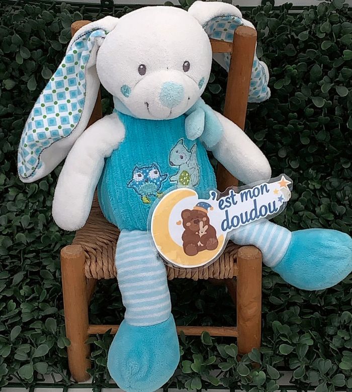 Format : peluche Genre : lapin Coloris : bleu Broderie : hibou, renard Marque : Mots d’enfants Mesure : 28cm État : très bon Stock : 2 RÉFÉRENCE : MD18 #motsdenfants_cestmondoudou