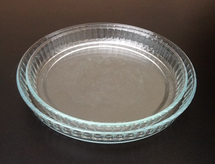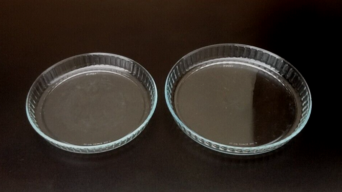 (article vendu en l' état, état d' usage micro rayures, voir toutes les photos) Années 1970 2 Moules à tarte Pyrex France Verre transparent Diamètre : 240mm Hauteur : 35mm Diamètre : 270mm Hauteur 35mm Poids total : 1kg470