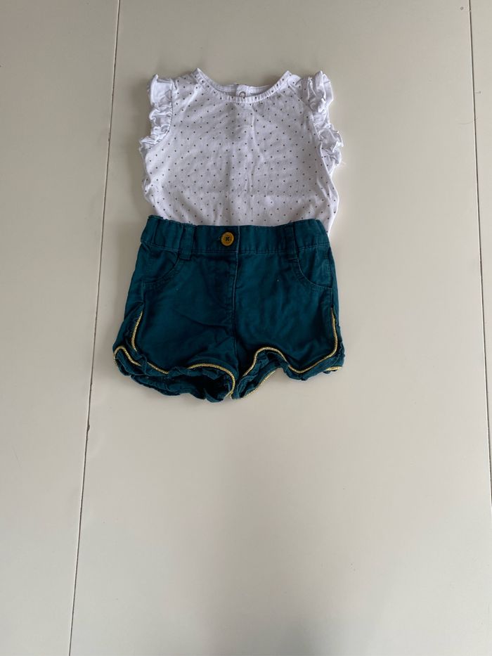 Ensemble short vert avec liserer or et t-shirt blanc à pois or