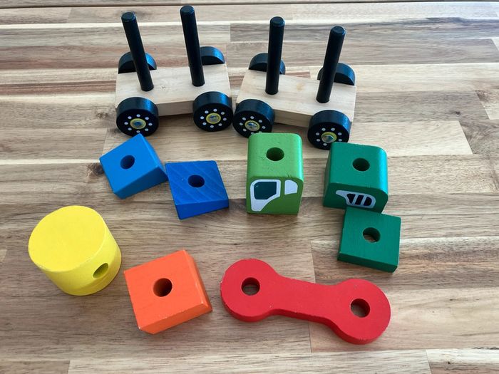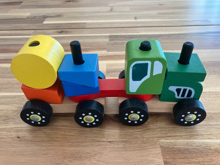 Train en bois à assembler. Il est en bon état général à l’exception de quelques angles où la peinture est un peu usée.