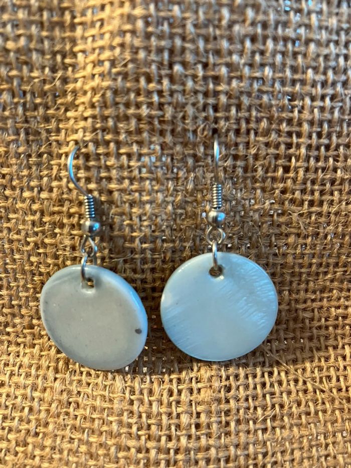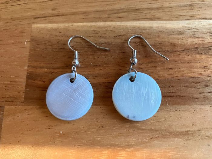 Paire de boucle d’oreille effet nacre. Diamètre 1cm. Les crochets ont quelques traces noircis.