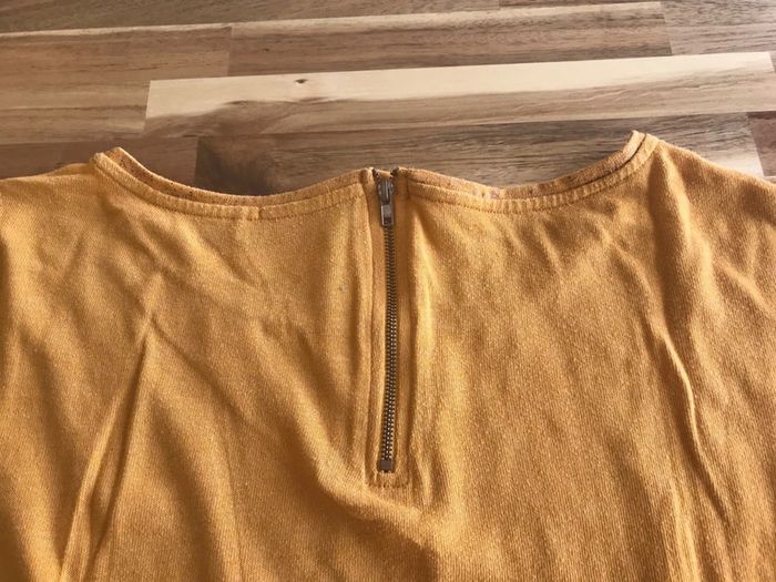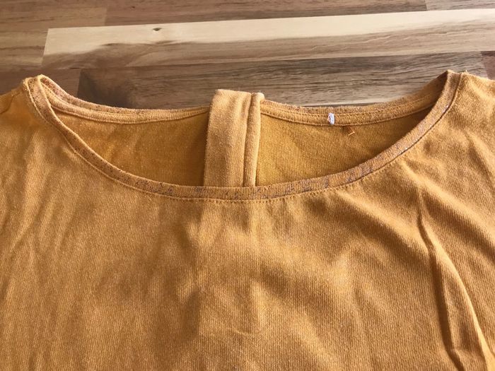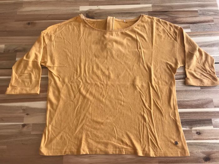 Pull fin en coton avec manches 3/4. Dans le dos présente d’une fermeture éclair. Il a été porté mais n’a ni tâche ni défaut.