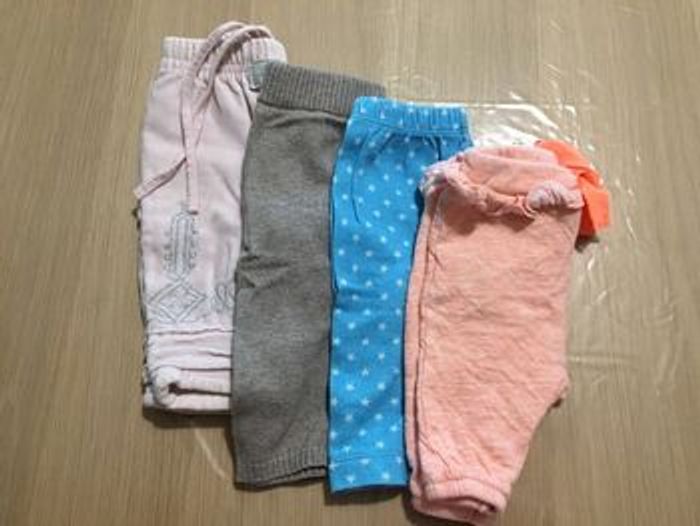 Lot de 4 pantalons taille 1 mois, toutefois certains taillent plus grand .... parfait pour aller du 1 au 3 mois. Un pantalon rose en coton assez fin Un pantalon bleu type legging Un pantalon en fines mailles marron Un pantalon plus chaud en velours fin rose pâle avec ouverture à l’entre jambes