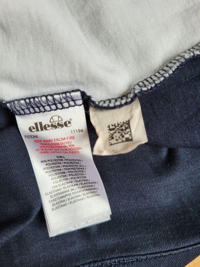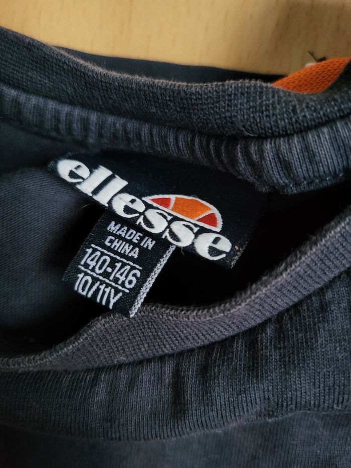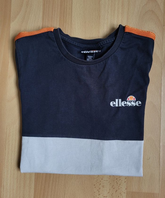 T-shirt Ellesse bleu marine et blanc, bandes oranges sur les épaules Bon état, pas de tàche ni de trous, logo poitrine et coutures nickels. il n'y a que la couleur bleu qui est légèrement délavée par les lavages Taille 140 / 146 cm = 10 / 11 ans