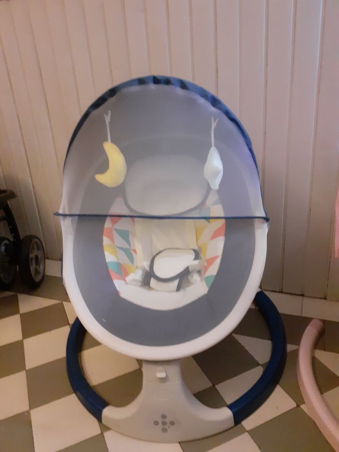 Vend balancelle état de neuf servie 1 fois plusieurs position de vitesse et balancement musique cle Usb peut-être utiliser sur prise secteur ou à piles avec telecommande a distance.