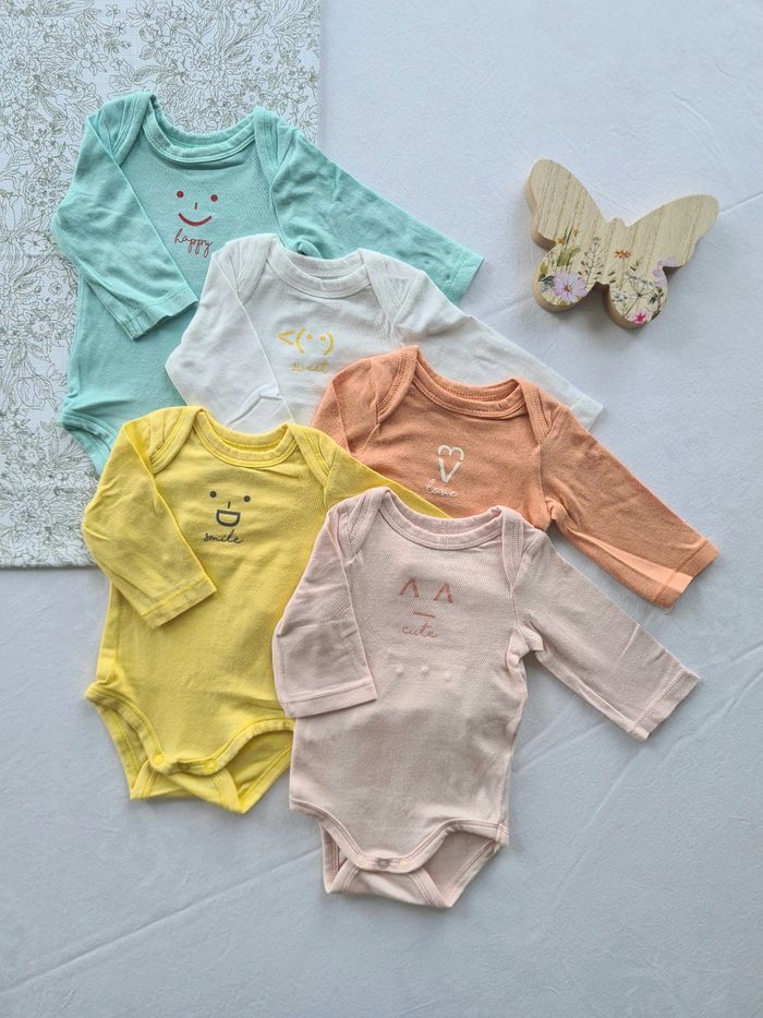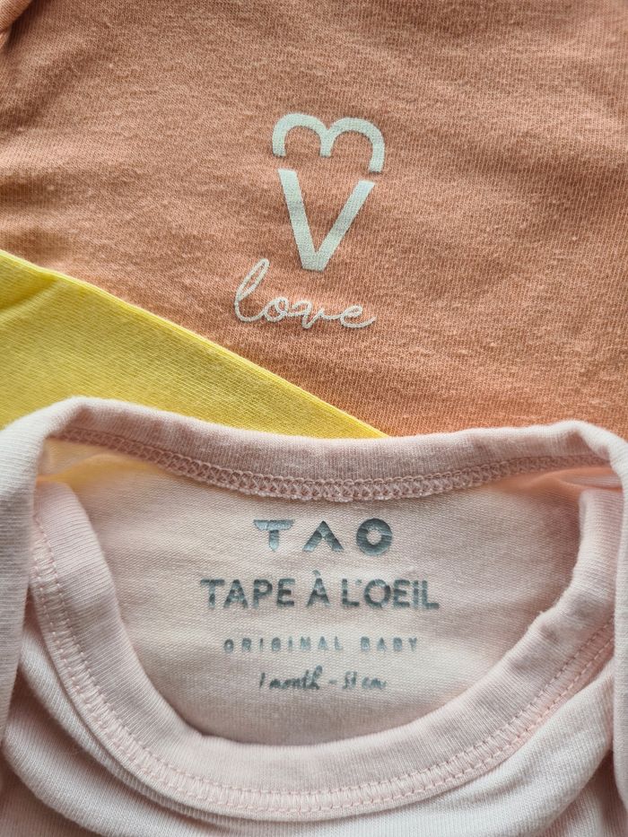 🌼 Lot de bodies à manches longues, très peu portés. 🔖 Tape à l'Oeil 🌈 Multicolore 🏷 1 mois / 53 cm 🧵 100% coton