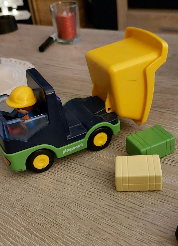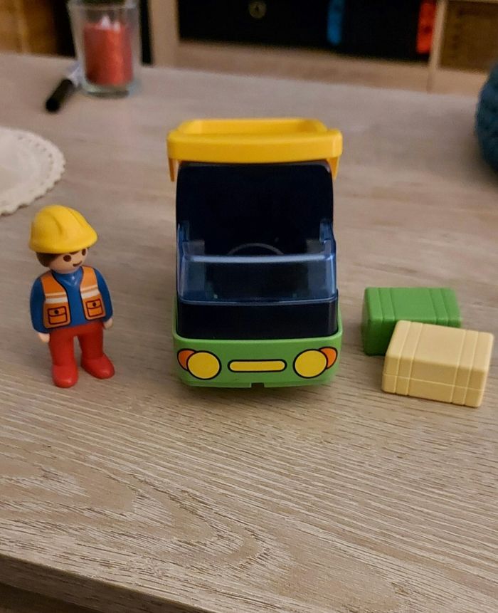 Lot playmobil 123 avec moto, camion benne, garage (manque 1 porte) et personnages.
