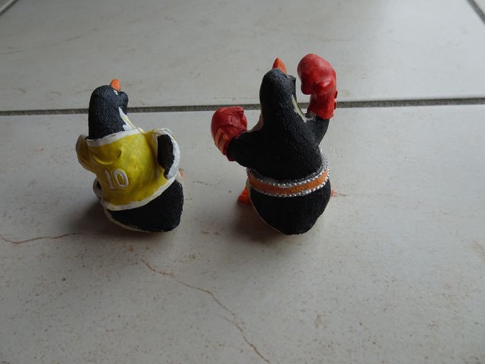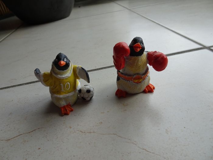 Lot de deux figurines pingouins anciennes, un pingouin football et un pingouin boxeur. 6 cm de hauteur. Figurines en matière fragile.
