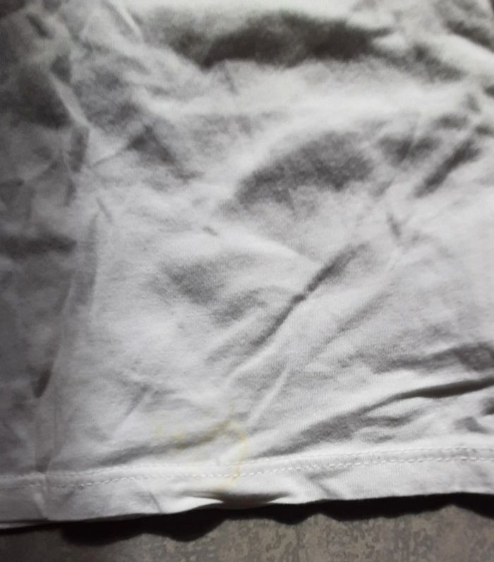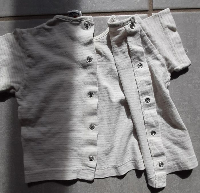 Lot de 5 tee shirt 12 mois le premier voir photo 4 tâche jaune en bas devant le 2eme photo 5 le col un peu jaunit et le 3eme photo 8 les pressions tiennent mais commence à s'arracher les 2 derniers en bon état d'où le prix du lot 😉