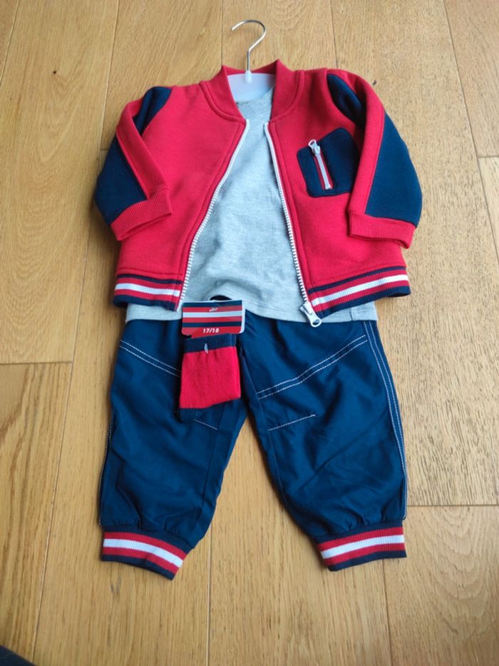 Ensemble 4 pièces taille 12mois Veste T-shirt manches longues Pantalon Chaussettes (taille 17/18) Neuf jamais porté