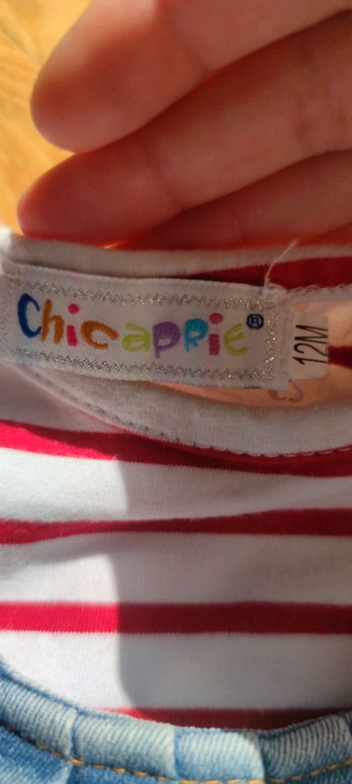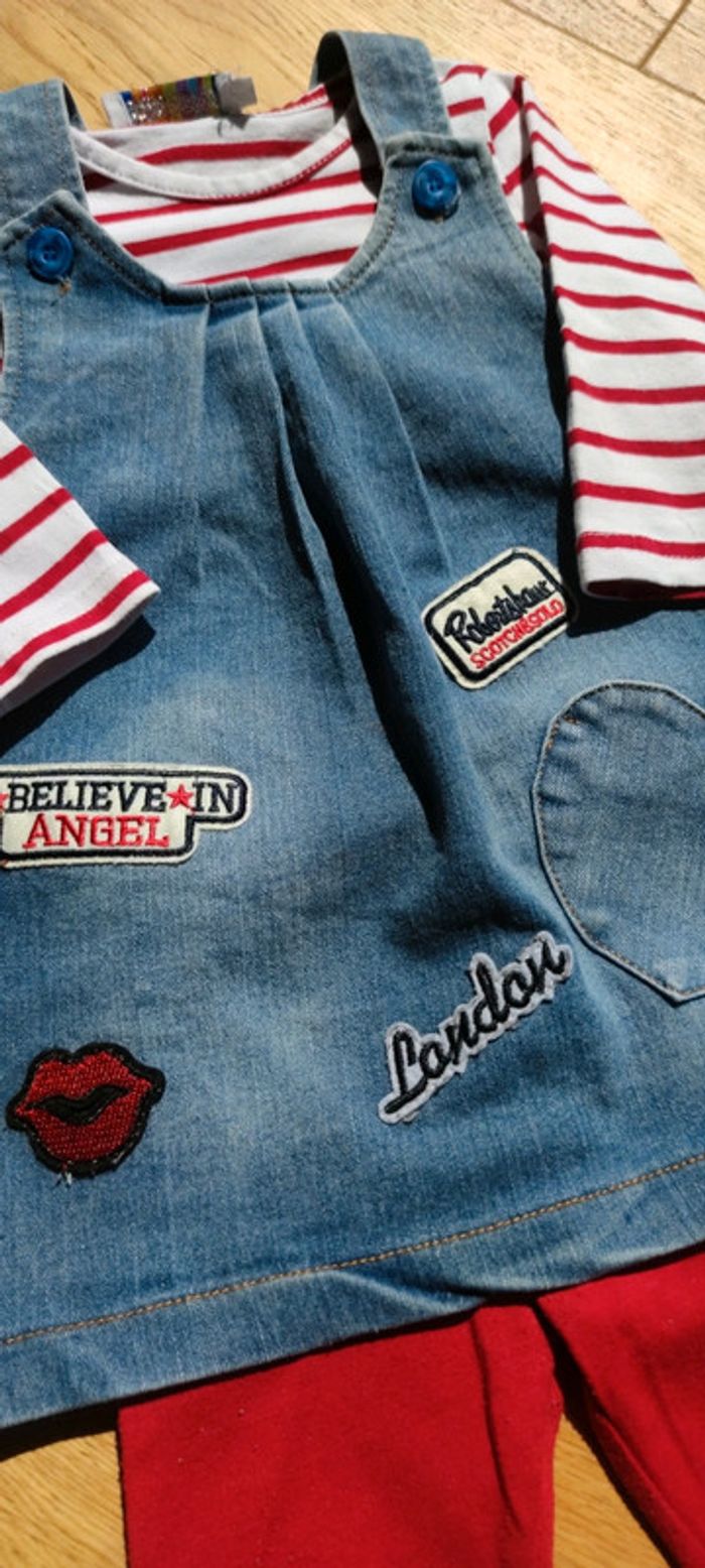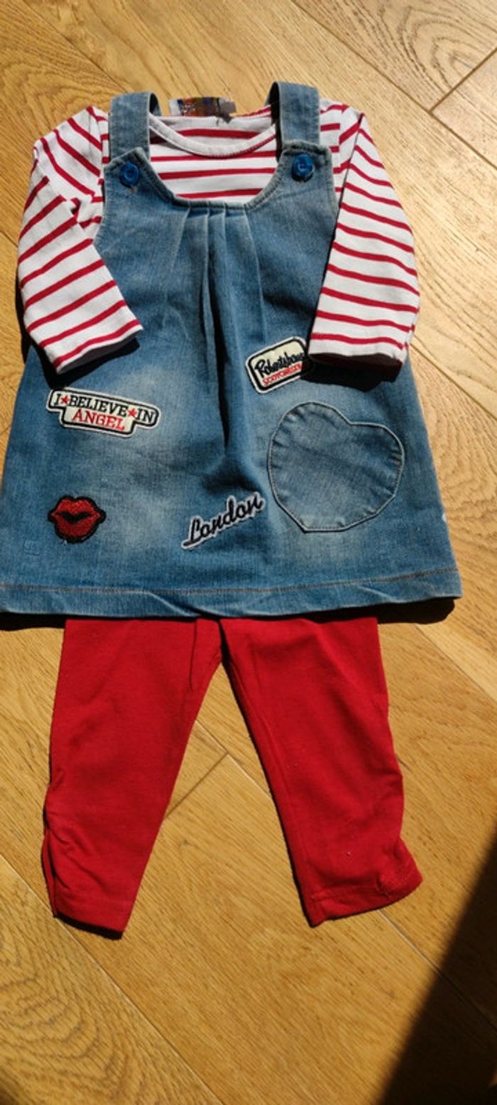 Robe en jean avec t-shirt marinière et legging rouge Taille 12mois