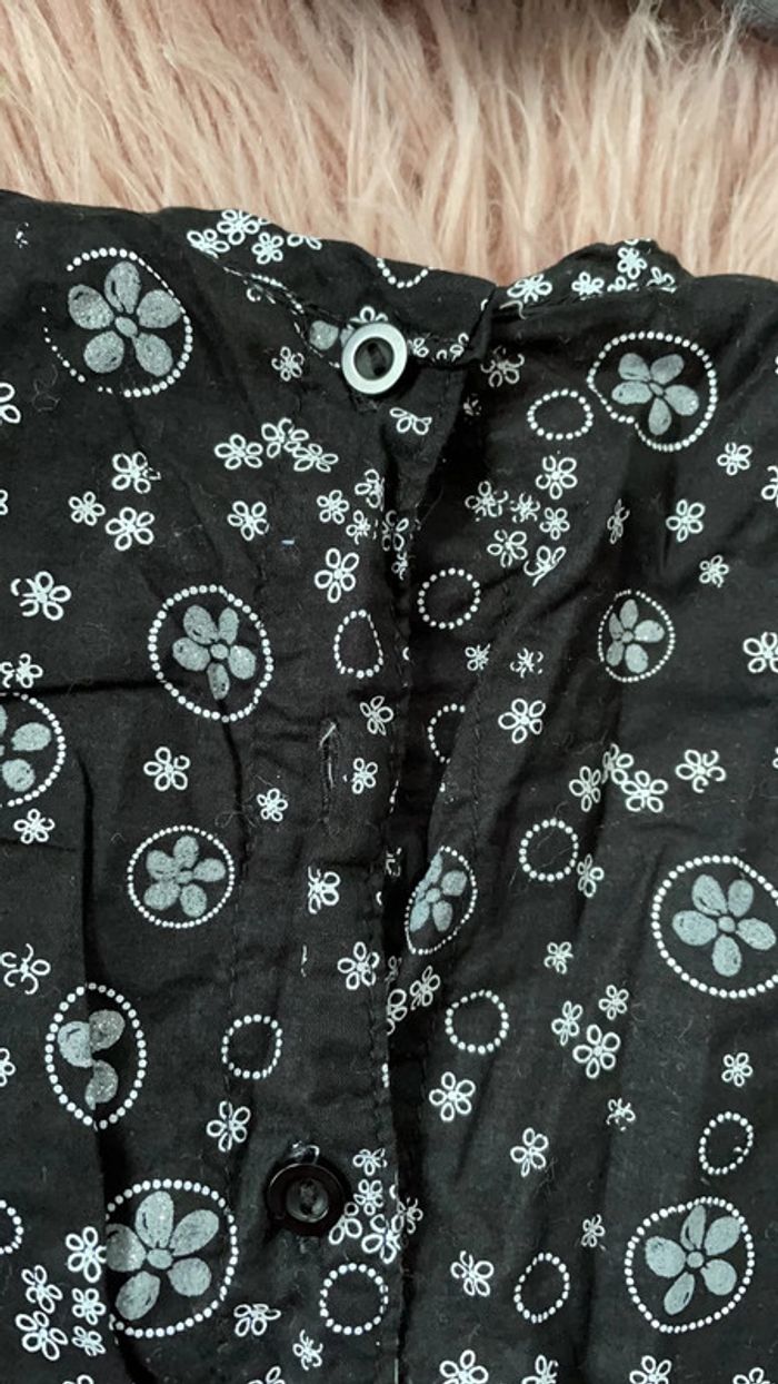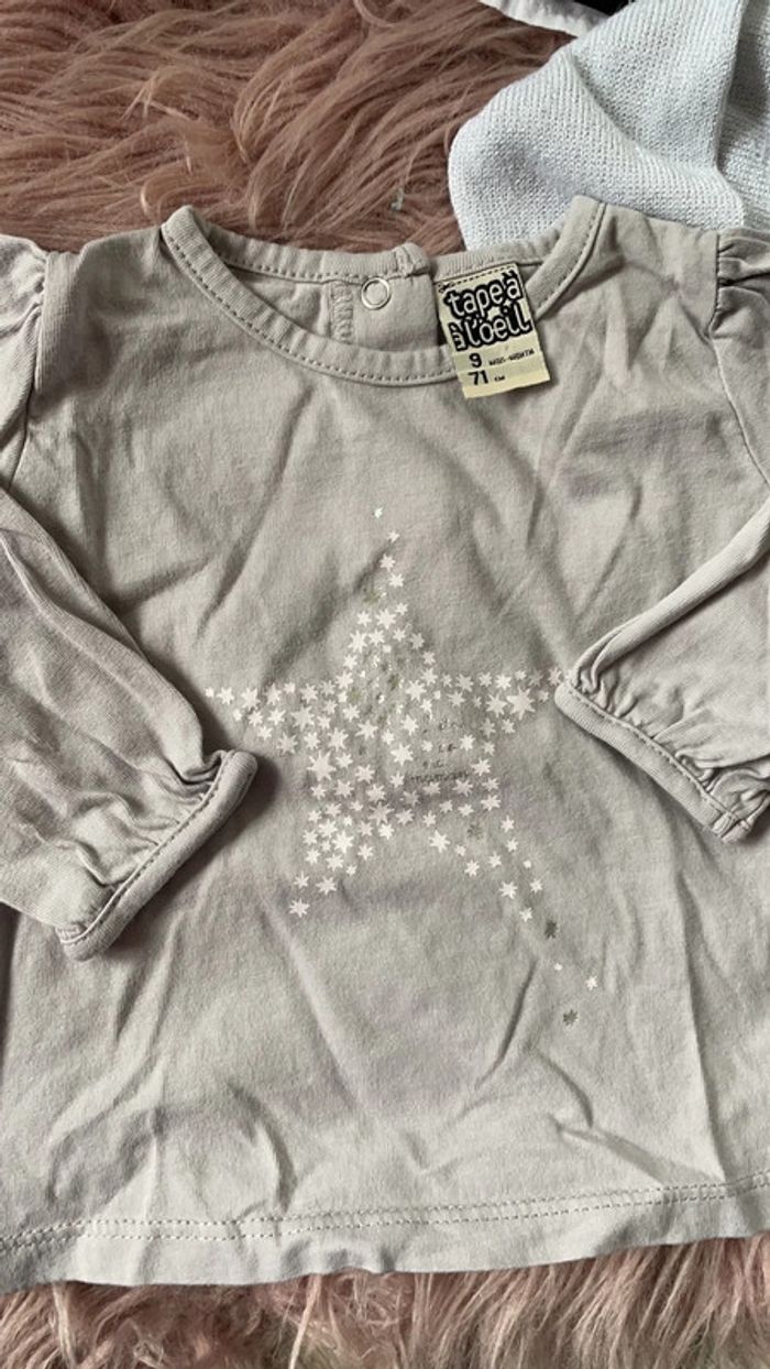 un chemisier TAO noir blanc et gris à paillettes boutonné dans le dos (manque un bouton facilement remplaçable pour les couturières) 9 mois 71cm , un t-shirt manches longues gris motif étoiles TAO 9 mois 71 cm et un gilet gris perle à paillettes 3 pommes 6-9 mois 74 cm, idéal pour les fêtes #tinesha62fille9mois