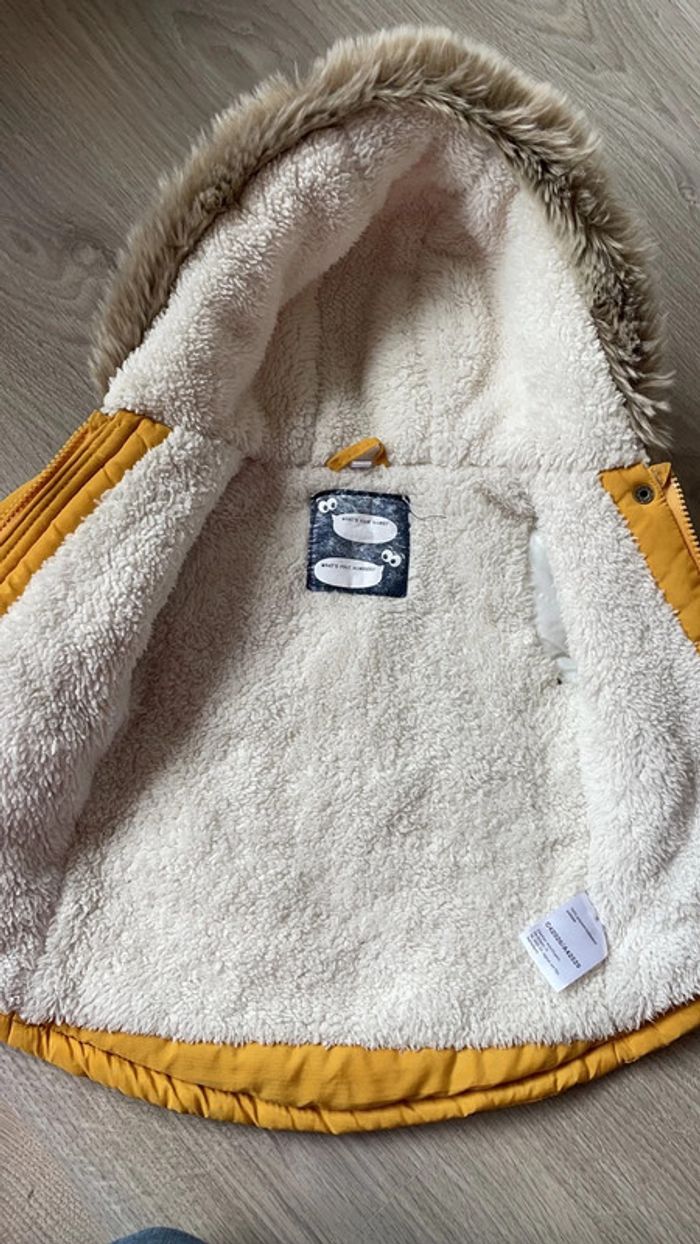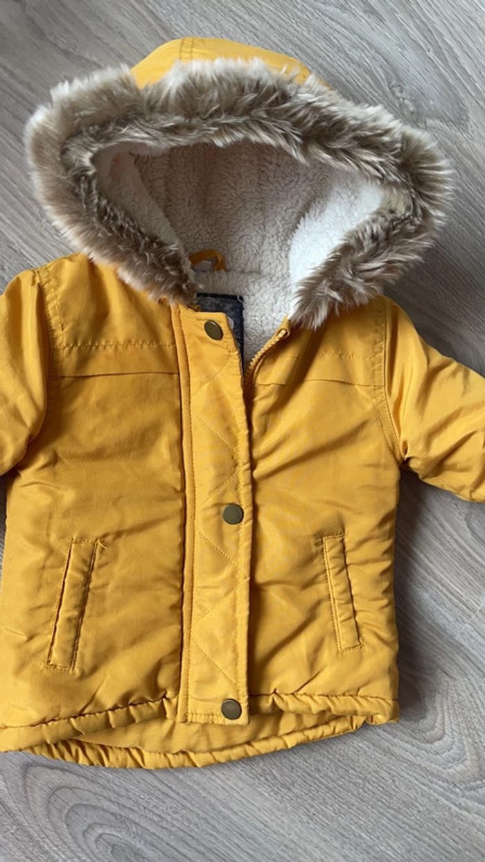 tres joli manteau à capuche moutarde intérieur moumoute 9/12 mois. (74 cm) très bon etat. fermeture à Zip et à pression #tinesha62fille9mois #tinesha62fille12mois