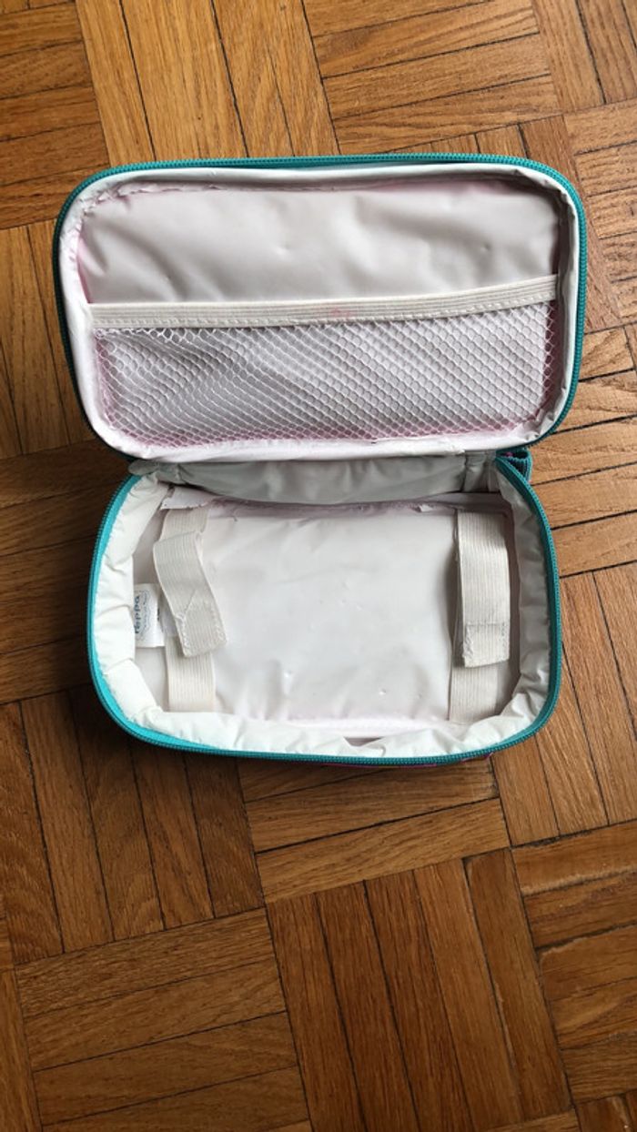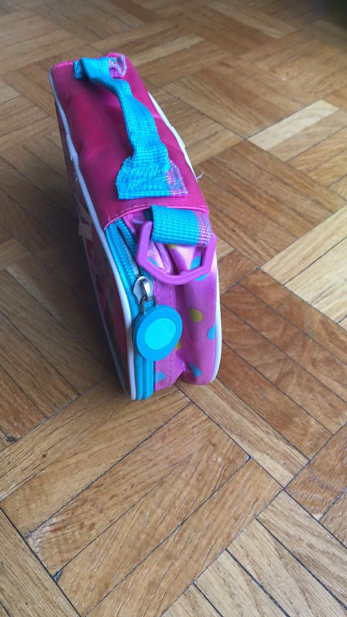 21x11,5 idéal pour y mettre le goûter ou les petits secrets de votre enfant.Une petite tache rose a l’intérieur sur l’élastique blanc voir photo et une petite tache sur le rond vert permettant de tirer la fermeture éclair