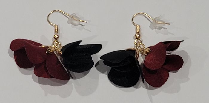 BOUCLES D'OREILLES BICOLORES FLEUR EN TISSU ROUGE NOIR ! NEUF! - photo numéro 3