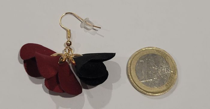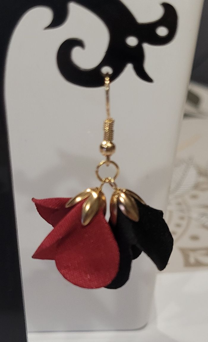 BOUCLES D'OREILLES BICOLORES FLEUR EN TISSU ROUGE NOIR ! NEUF! - photo numéro 4