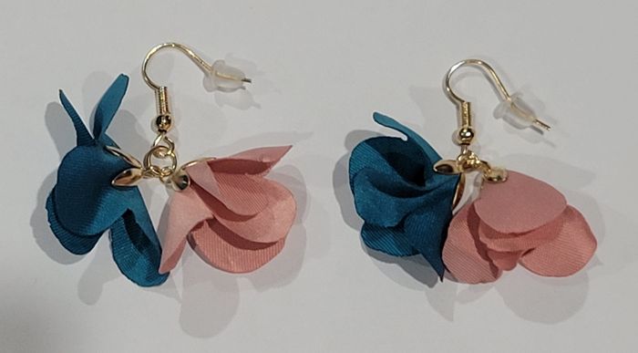 BOUCLES D'OREILLES BICOLORES FLEUR EN TISSU ROSE BLEU ! NEUF! - photo numéro 3