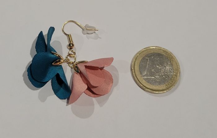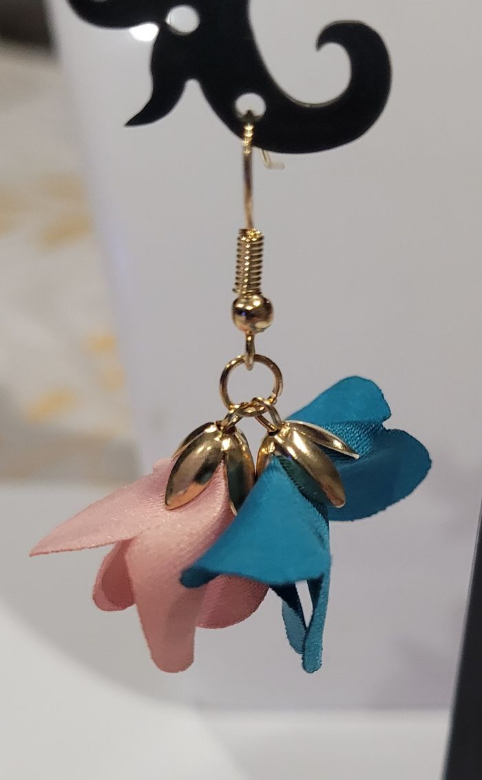 BOUCLES D'OREILLES BICOLORES FLEUR EN TISSU ROSE BLEU ! NEUF! - photo numéro 4