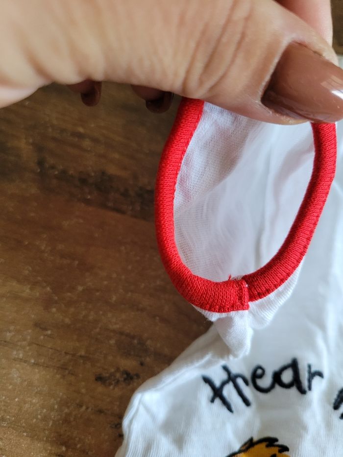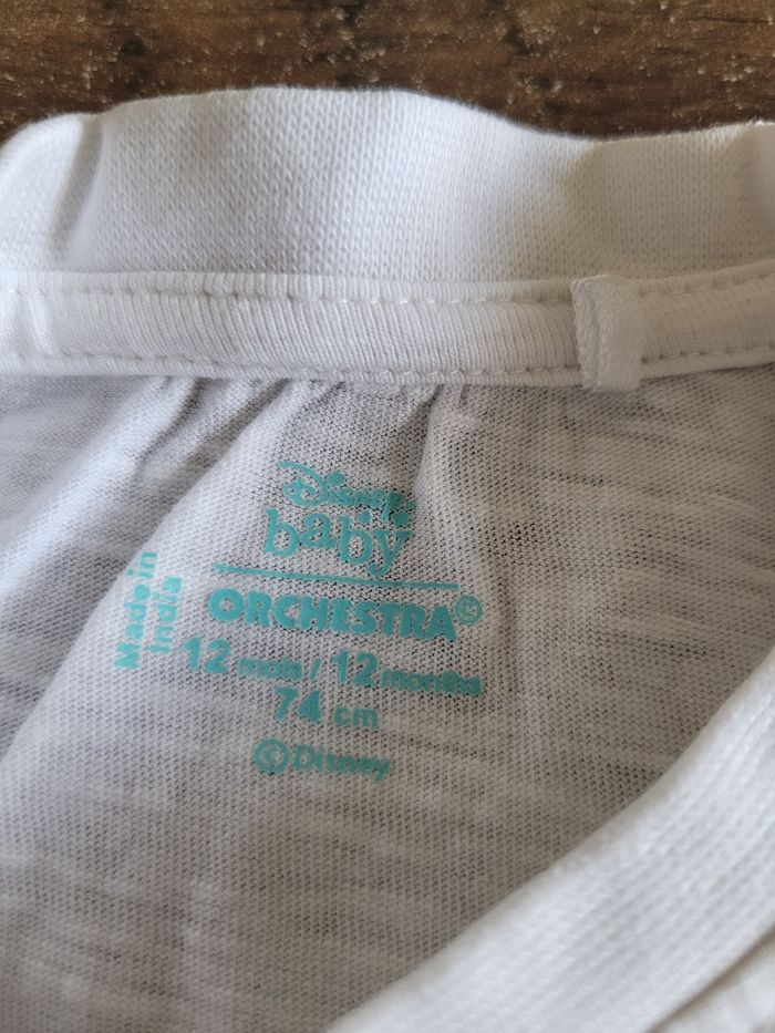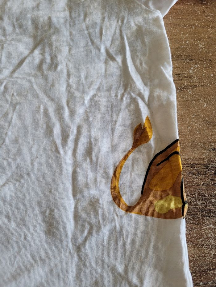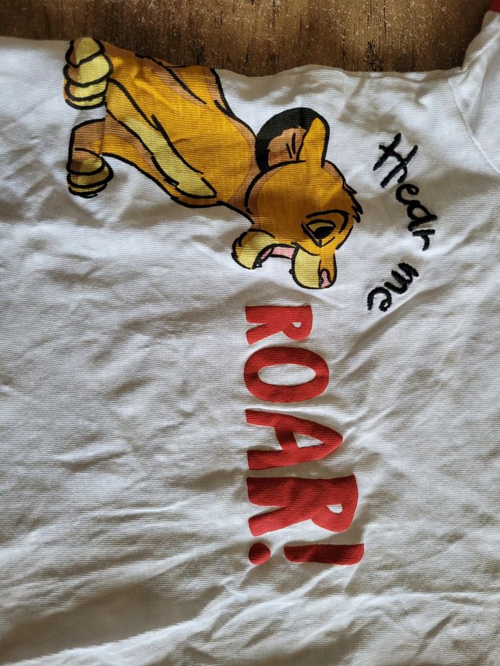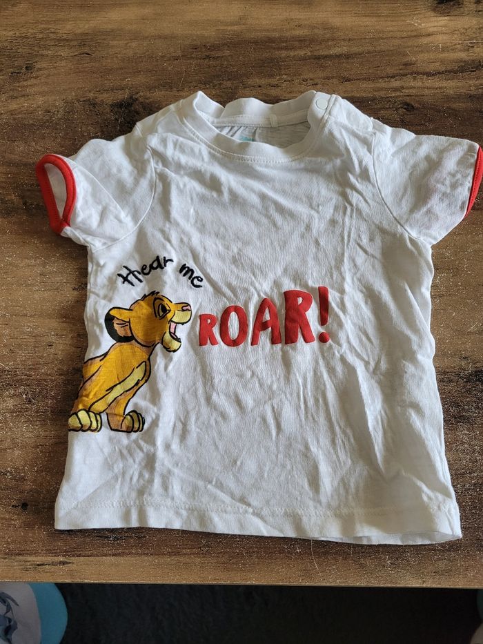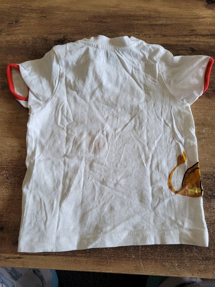 Petit T-shirt Manche court Couleur blanc et un peu de rouge Dessin simba Taille 12 mois Mi saison Voir tous saison Attaché en haut a gauche Matière 100% coton