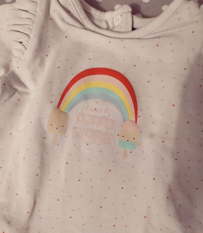 Très joli t-shirt avec body intégré Motif arc en ciel parfait état Ouverture pressions au dos et à l'entrejambe Parfait état