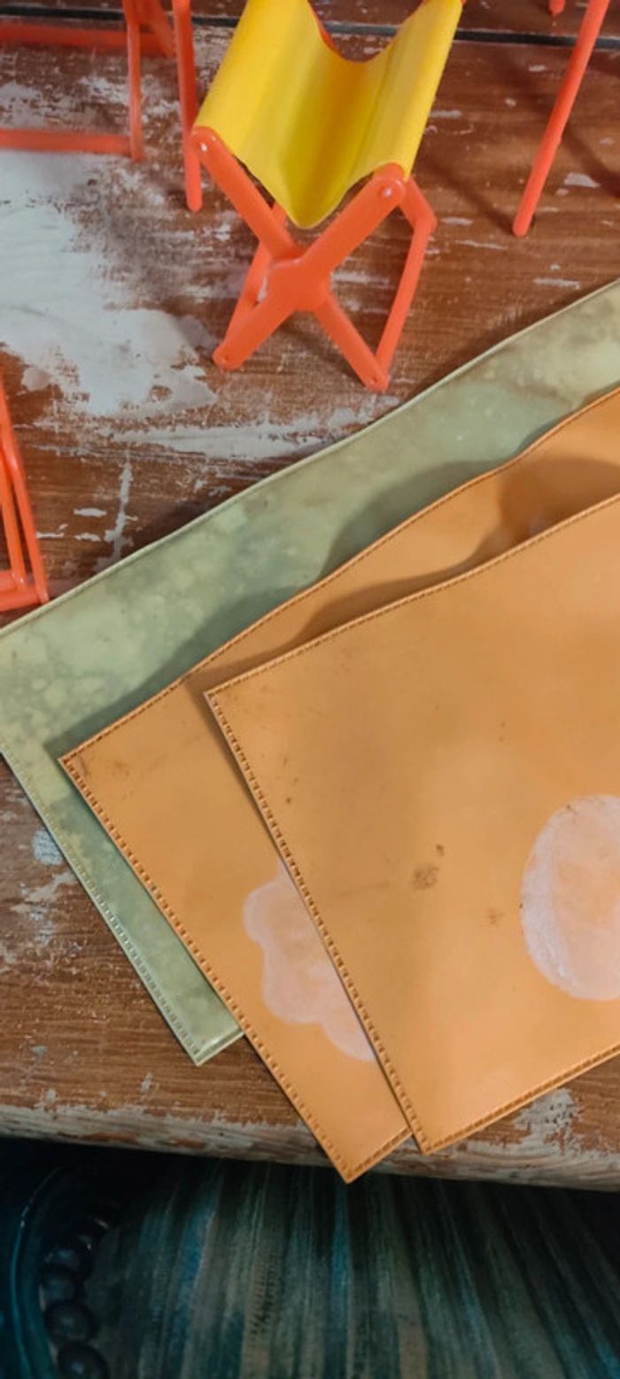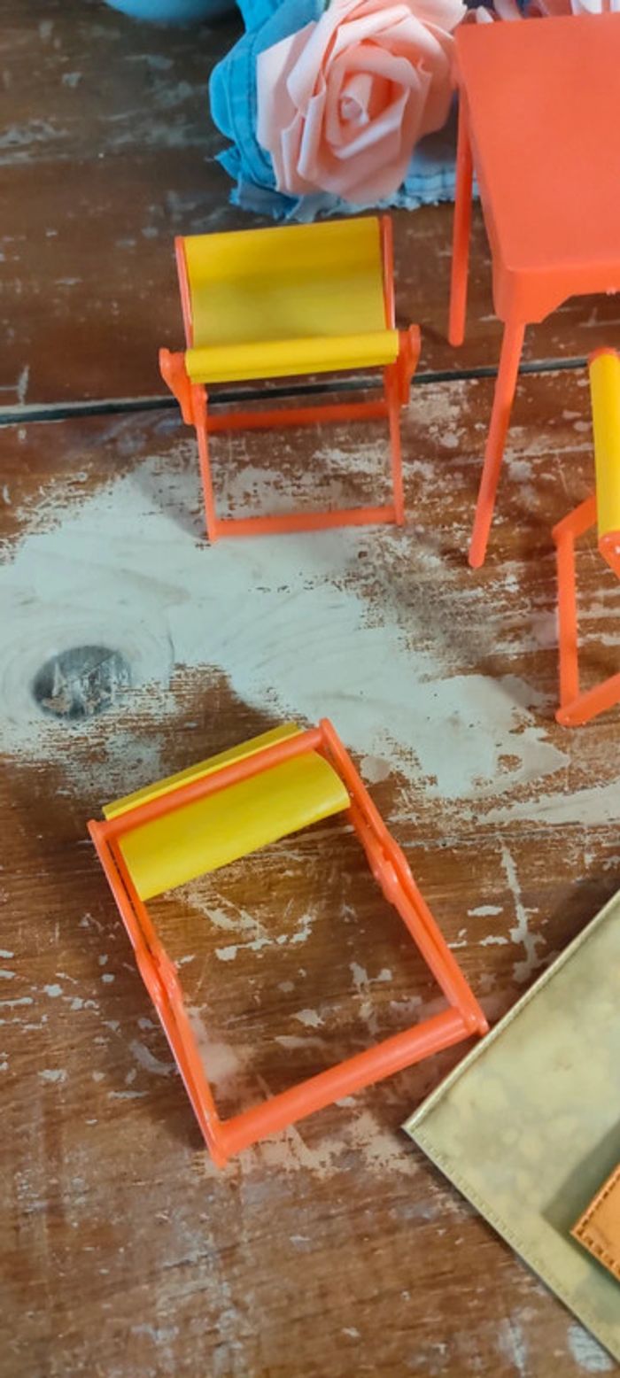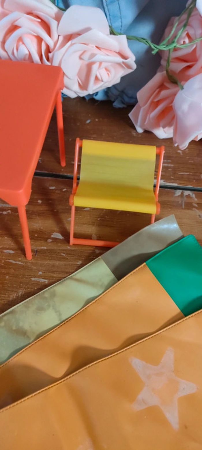 Élément de camping pour barbie année 70 3 sacs de couchage 4 chaises pliantes (1 des pieds est cassé) 1 table avec 4 pieds qui s'enlève 1 des pieds tient mal