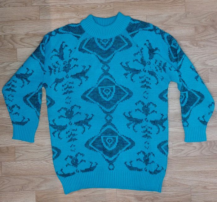Pull bleu vintage manches longues à motifs - photo numéro 1