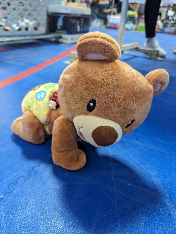 Un vrai compagnon de marche pour Bébé, l'ourson en peluche 1, 2, 3, suis-moi est aussi un adorable doudou pour les câlins ! Ourson qui marche Un ourson tout doux et tout mignon qui encourage les tout-petits à se déplacer, à chanter et à découvrir de nouveaux mots. Il avance tout seul et marche à 4 pattes comme un vrai bébé et stimule la motricité et la curiosité de Bébé. Quatres boutons interactifs pour accompagner bébé dans sa découverte des formes et des couleurs et pour écouter des chansons. En excellent état. Prix d'achat : 40€