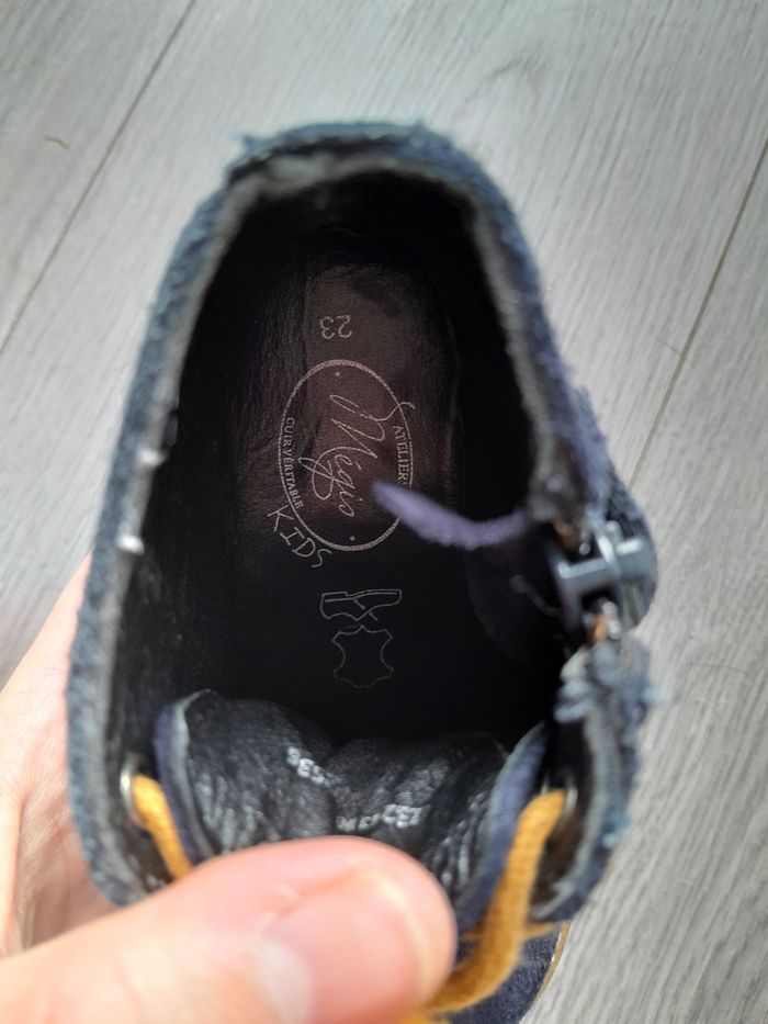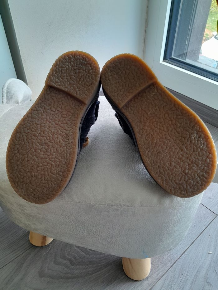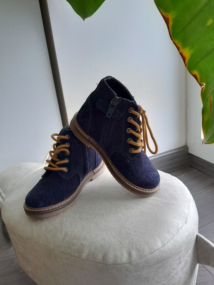 Bottines petit garçon, bleu marine, à lacets et fermeture éclair. En simili daims et semelles intérieures cuir. Taille 23. Mon petit garçon n'a jamais voulu les porter.