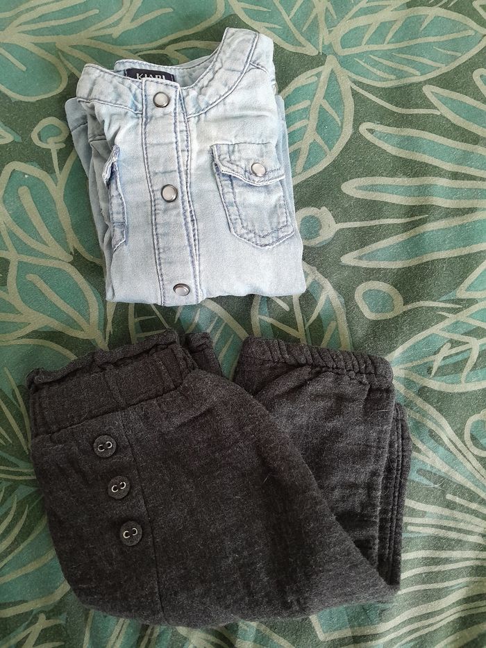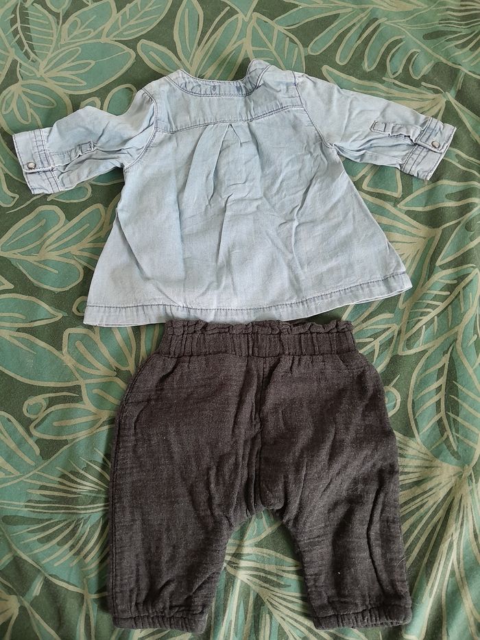 Jolinpetit ensemble composé d'une chemise en jean ample, fermeture à pression et pantalon noir en gaz de coton, bouton décoratifs. Chemise et pantalon: Kiabi - Taille 1 mois. Léger et facile à porter en mi-saison.