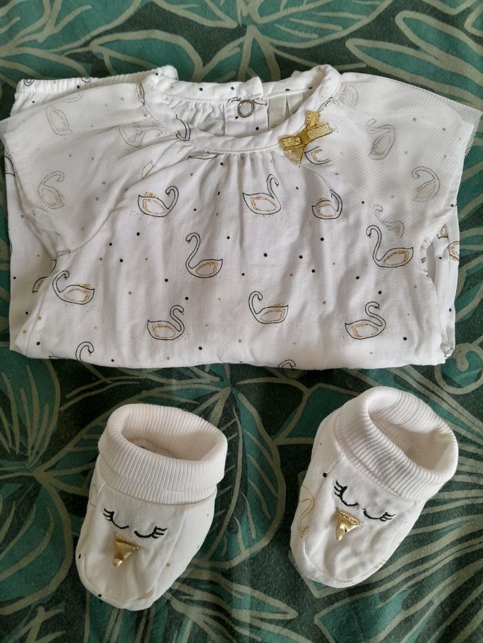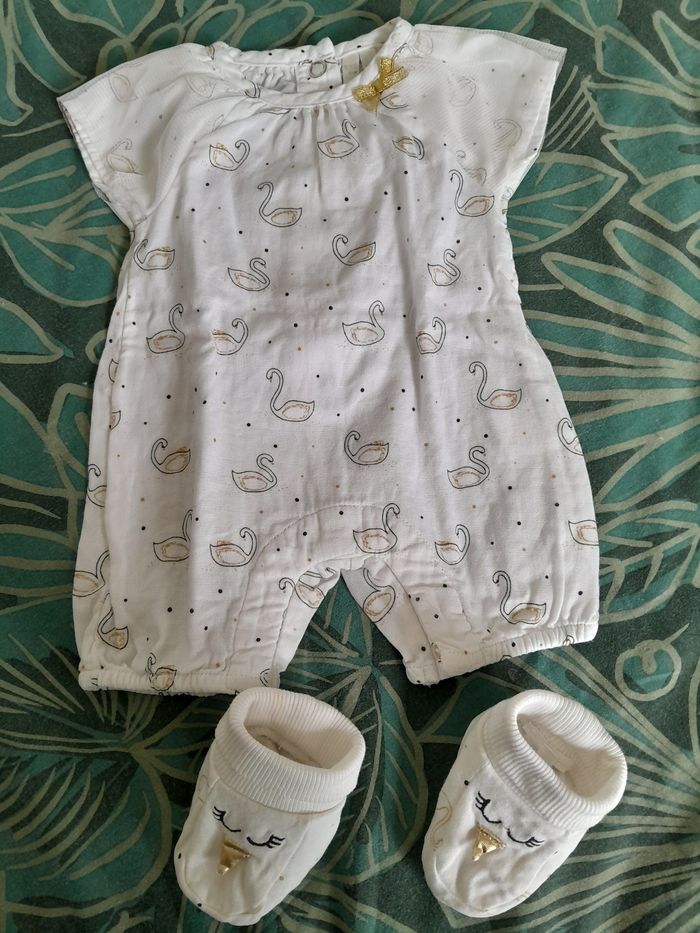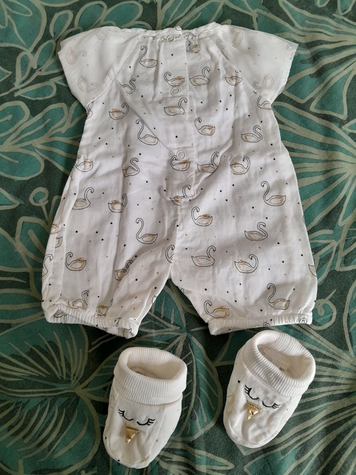 Très joli combinaison d'été, legere, avec motifs cygnes. Tulle décoratif sur les manches et petit nœud doré sur le col. Ouverture-fermeture grâce à des boutons pressions dans le dos et à l'entre-jambes. Taille naissance - Orchestra. Petits chaussons qui vont avec.