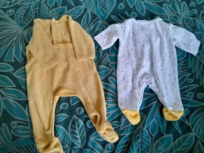 1 pyjama jaune, TeX Basic, 1 mois, en velours, détail éléphant. 1 pyjama blanc à pois, Mots d'enfants, en velours, 1 mois, avec poches sur le devant et motif lapin. (Le décalcomanies lapin commence à se decoler).