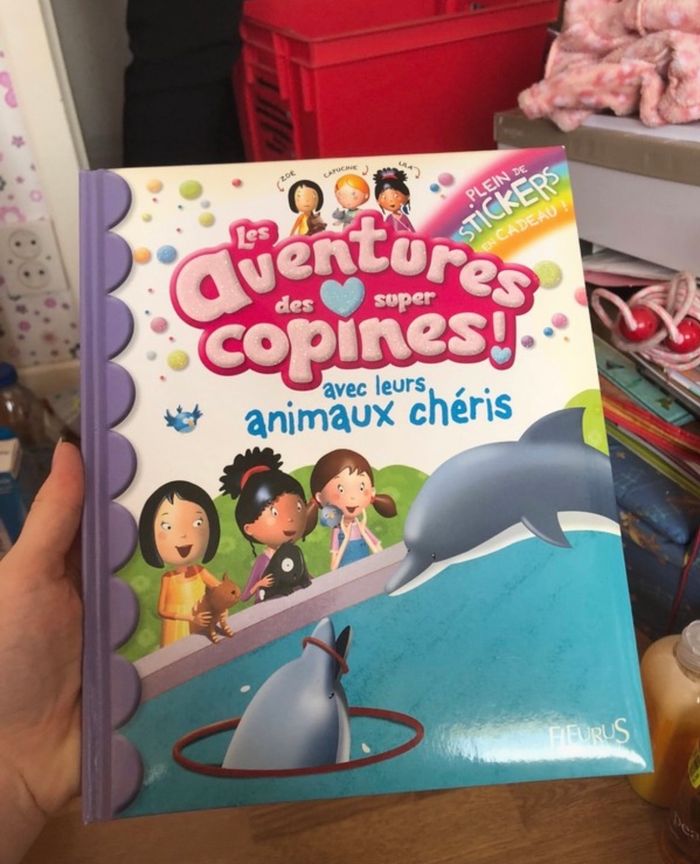 Livre les aventures des super copines avec leurs animaux chéris. Contient pleins de stickers. La couverture a un peu jaunie avec le soleil.