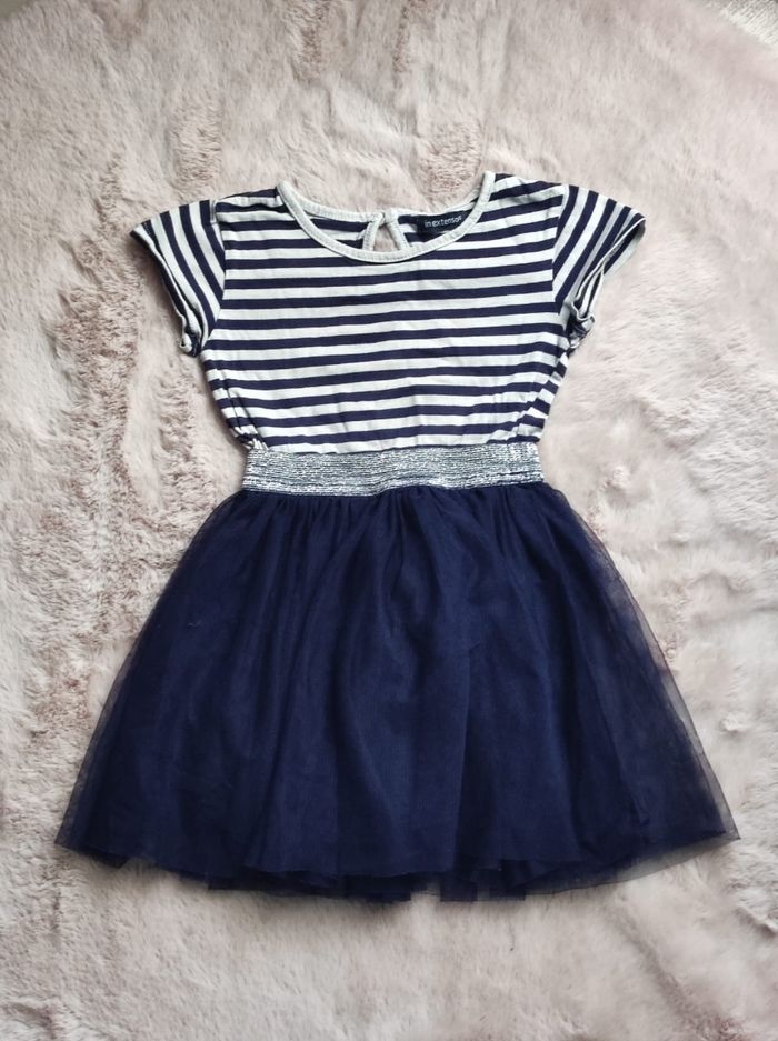 Jolie robe a motifs marinière et bas en tulle souple de chez in extenso en 4 ans.