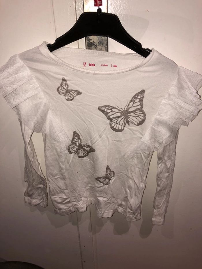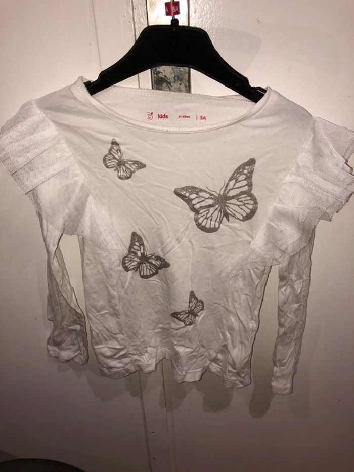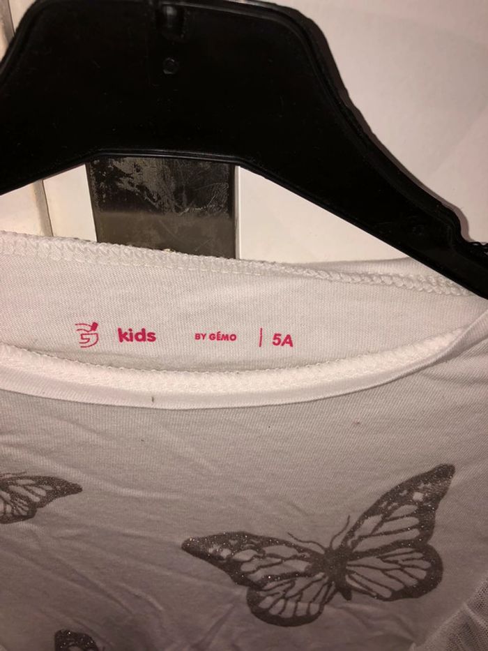 Top blanc orné de papillons argentés « Gemo » en excellent état. Taille 5 ans. Si vous souhaitez plus de photos ou d’infos, n’hésitez pas à me demander. #maelea1fille5ans