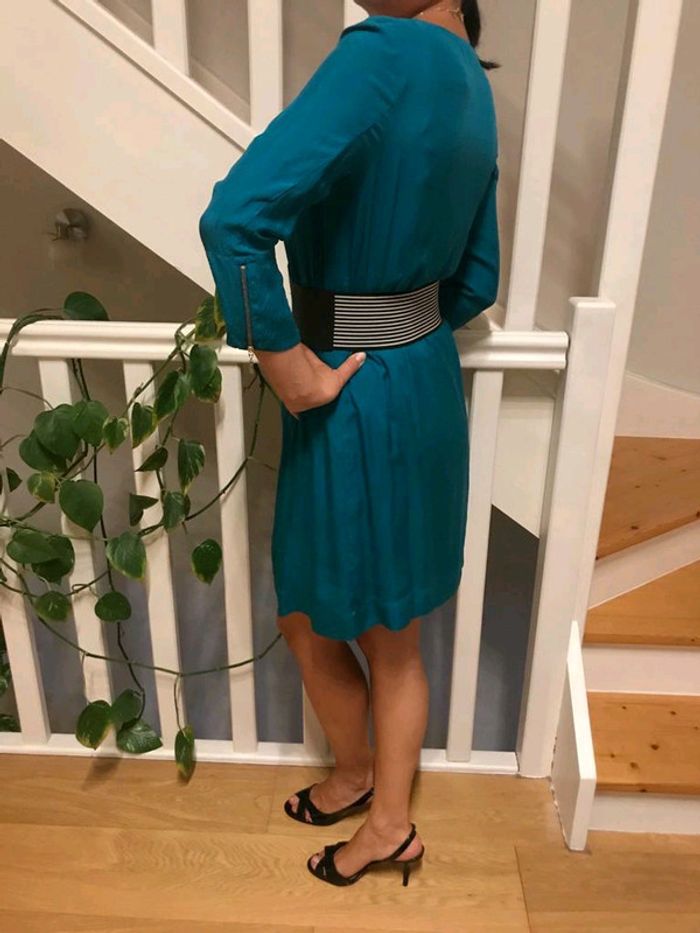 Superbe robe Kookaï 100%soie Taille 36,je dirais un petit 36 Vendue sans ceinture La couleur c'est un vert d'eau Manches 3/4 Elle a une fermeture éclair a chaque manche,très chic Elle est doublé donc pas du tout transparente Un élastique autour de la taille interrompu devant,elle peut dire coup être très bien porté sans ceinture tout aussi bien