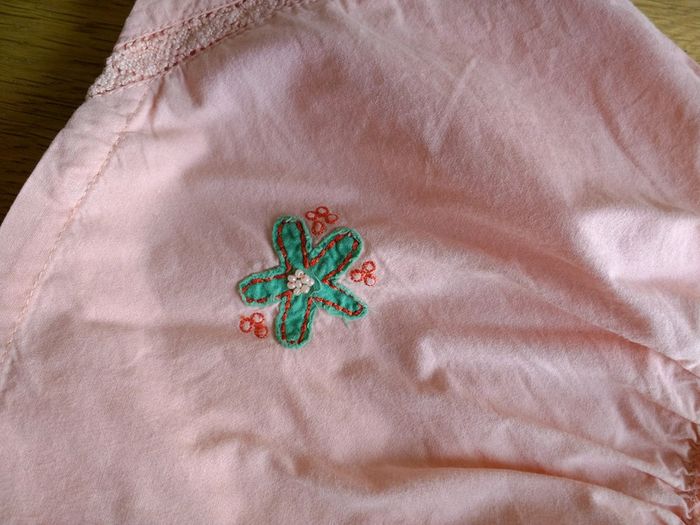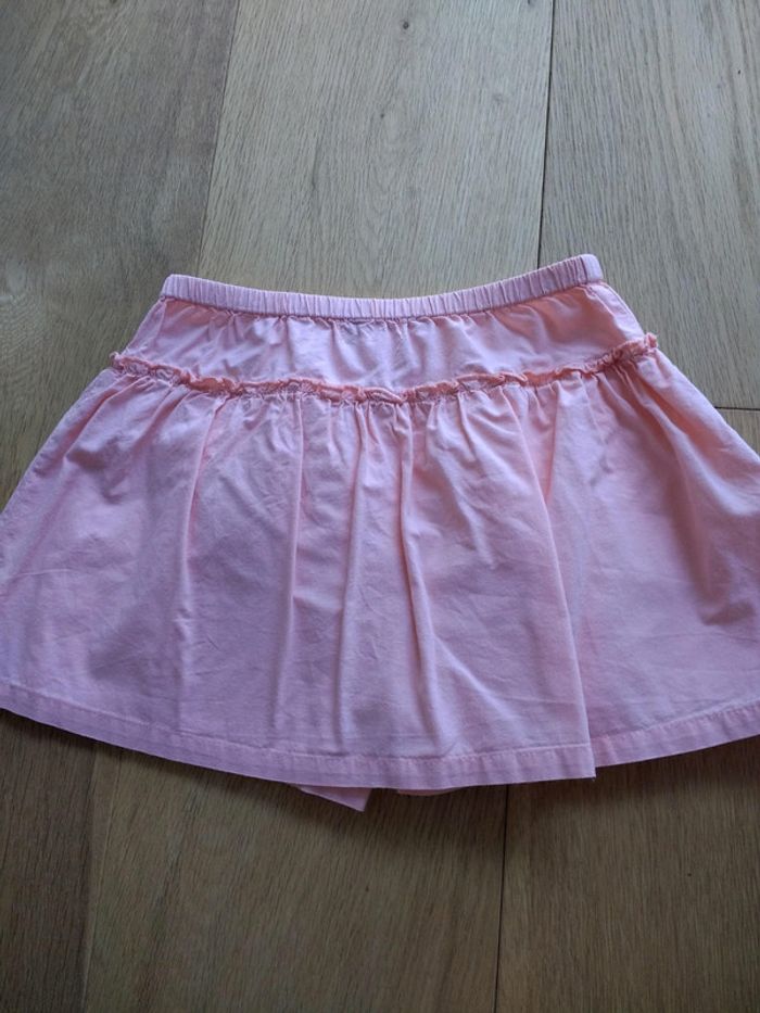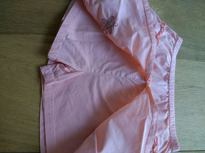 Jupe avec pantalon court intégrés en dessous, couleur plustôt pêche claire que roz Fleur avec paiettes