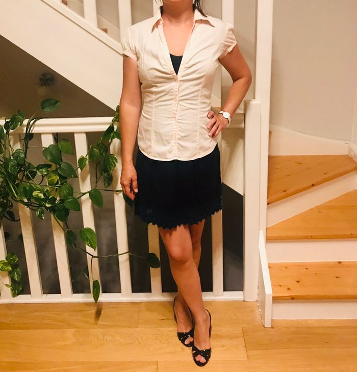 Chemise rose poudrée cambré Pour un style office élégant En cotton Portée plusieurs fois,sans tache ni défaut J'ai coupé l'étiquette mais ça correspond a du S bien centré ou du XS,moi je suis un S-M maintenant donc un peu serre comme ça se voit dans la photo