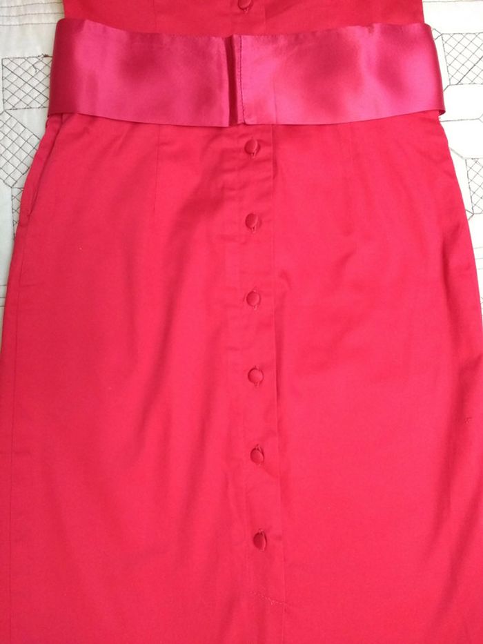 Robe bustier rouge avec sa ceinture en satin La ceinture n'est pas attaché,c'est une ceinture bandeau, le noeud dans la photo je l'ai fait juste pour la photo,vous pouvez le faire comme vous voulez Dans la deuxième photo je vous montre que la robe a de prévu des attaches si vous voulez lui rajouter des bretelles,mais elle n'a pas été vendu avec des bretelles