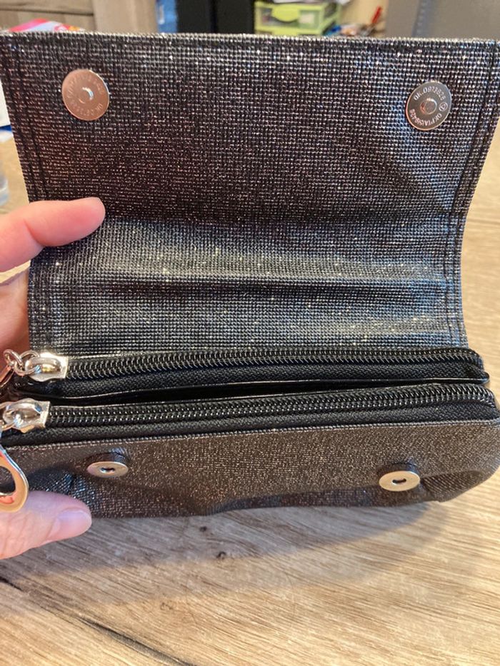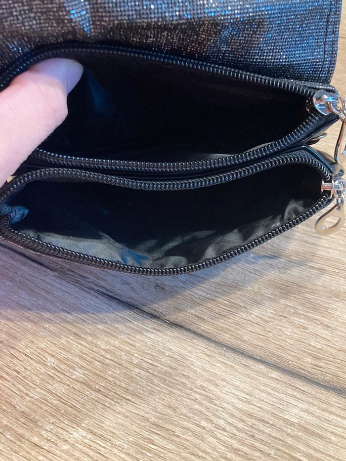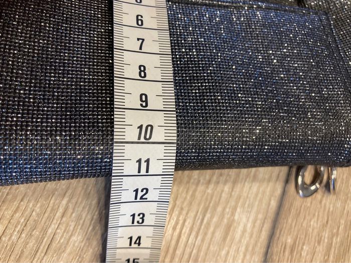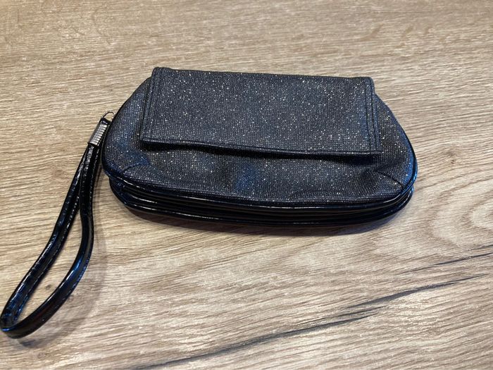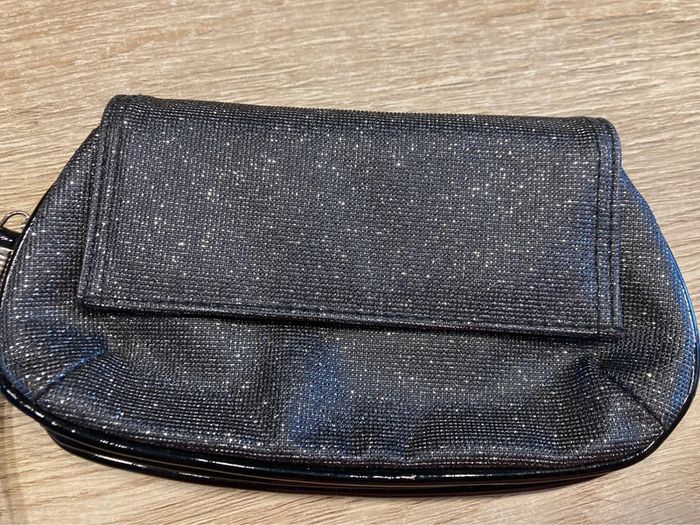 Très jolie pochette, je ne l’ai jamais utilisée . Noire pailletée. Dimensions sur les photos. Maison non fumeurs