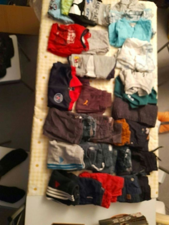 Lot garçon 6 a 12 mois. 2 combi short 4 t shirt 1 ensembles 3 chemises manche longues et courtes 2 pull 1 gilet en laine 1 gilet mickey 1 gilet psg 17 jean et jogging Dont bas de jogging adidas puma airness